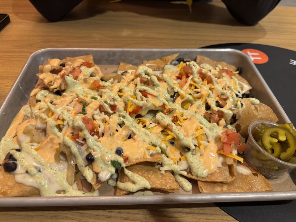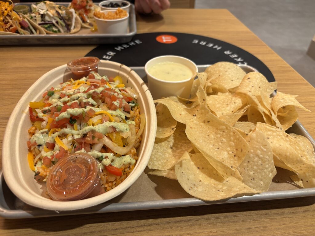 Day 1 – Veggie rice bowl with chips and queso, Gringo taco, steak taco, Korean BBQ taco, and a strawberry margarita. Everything was really good. Queso had good flavor with a hint of spice, veggie rice bowl had flavored rice, lots of vegetables, and a divine poblano cream sauce.